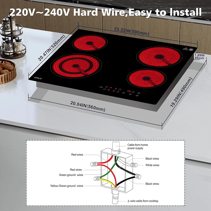 FLEXIBLE - (220-240V for Hard Wire, No Plug)24" Built-In Electric Cooktop 4 Burners: 2200/1000W, 1200W, 1800W and 1200W, making it ideal for cooking a wide range of dishes simultaneously. Among them, the 2200W dual-ring element that can handle any pan size and cook more faster