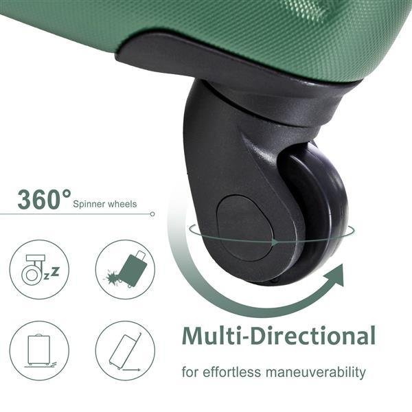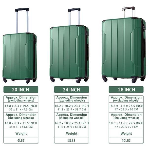 CARRY-ON/CHECKED LUGGAGE20 inch,24 inch,28 inch, can be stored one into another.The carry-on size dimensions will meet most airline approved.Superior quality, silent-running, multi-directional silent spinner wheels assure smooth maneuverability and bring comfort to your journey. The ABS material company with the reinforced metal corner, making the entire suitcase more durable, which can be eligible for any situation that needs to be facing long-distance travel. Large storage space and fully lined interior with zippered compartment to organize your belongings. The 3-digit combination lock always protects your trip security. Protective anti-aging feature of built-in UV-radiation protection for long-lasting usage for years to come. 3-Digit TSA combination lock helps keep your possessions safe and secure. The handle of this luggage can be adjusted according to your height and is ergonomically designed to be easily raised and lowered.ATTENTION: [Sell in single on this page, not sets]Extra Details: 100% ABS material, lightweight and durable 4 Quiet Spinner Wheels TSA Combination Lock Organized Interior Mesh Zip Pocket Tie-down Straps.HOW DO I RESET THE COMBINATION LOCK1. The lock is set to 0-0-0 at the factory.2. Locate the reset button adjacent to the dials, push it and hold while you rotate the dials to your desired 3-digit code.3. Release the reset button and your code is now set.4. Scramble the dials and test your new code to be sure the correct one is set.ABS Hard Shell: The material has excellent wear resistance and impact resistance, and is lightweight. Durable luggage can withstand transportation and keep your belongings safe. Lightweight luggage makes traveling effortless and enjoyable.Carry-on Luggage: size: 13.8*8.3*21.5". The 2 -inch size complies with airline standards and is ideal for short trips and business trips. The top of the suitcase is equipped with a TPE reinforced handle for easy carrying.TSA Approved Lock: Each travel luggage comes with 3-dial TSA approved combination lock to better protects your property and facilitate customs clearance.Telescopic Handle: 3-level adjustable handle to meet the needs of users of different heights.Metal Corner Protectors: Reduce wear and tear on the suitcase caused by collisions and prolong the service life of the suitcase.