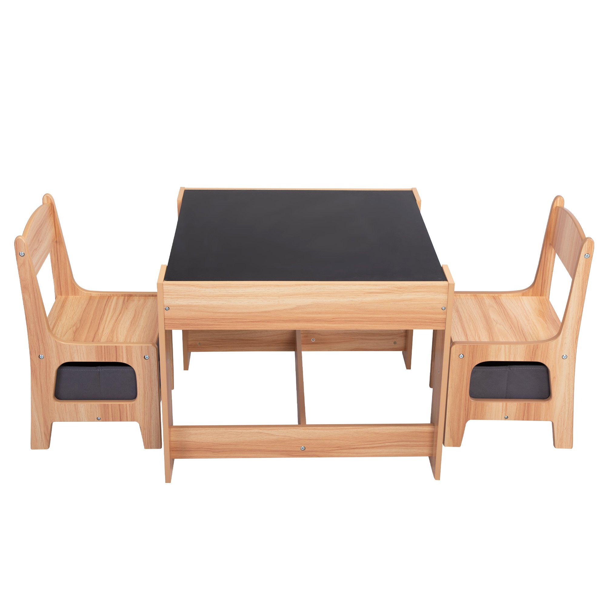 3-in-1 Kids Wood Table and 2 Chairs, Children Activity Table Set with Storage, Blackboard, Double-Sided Table for Drawing