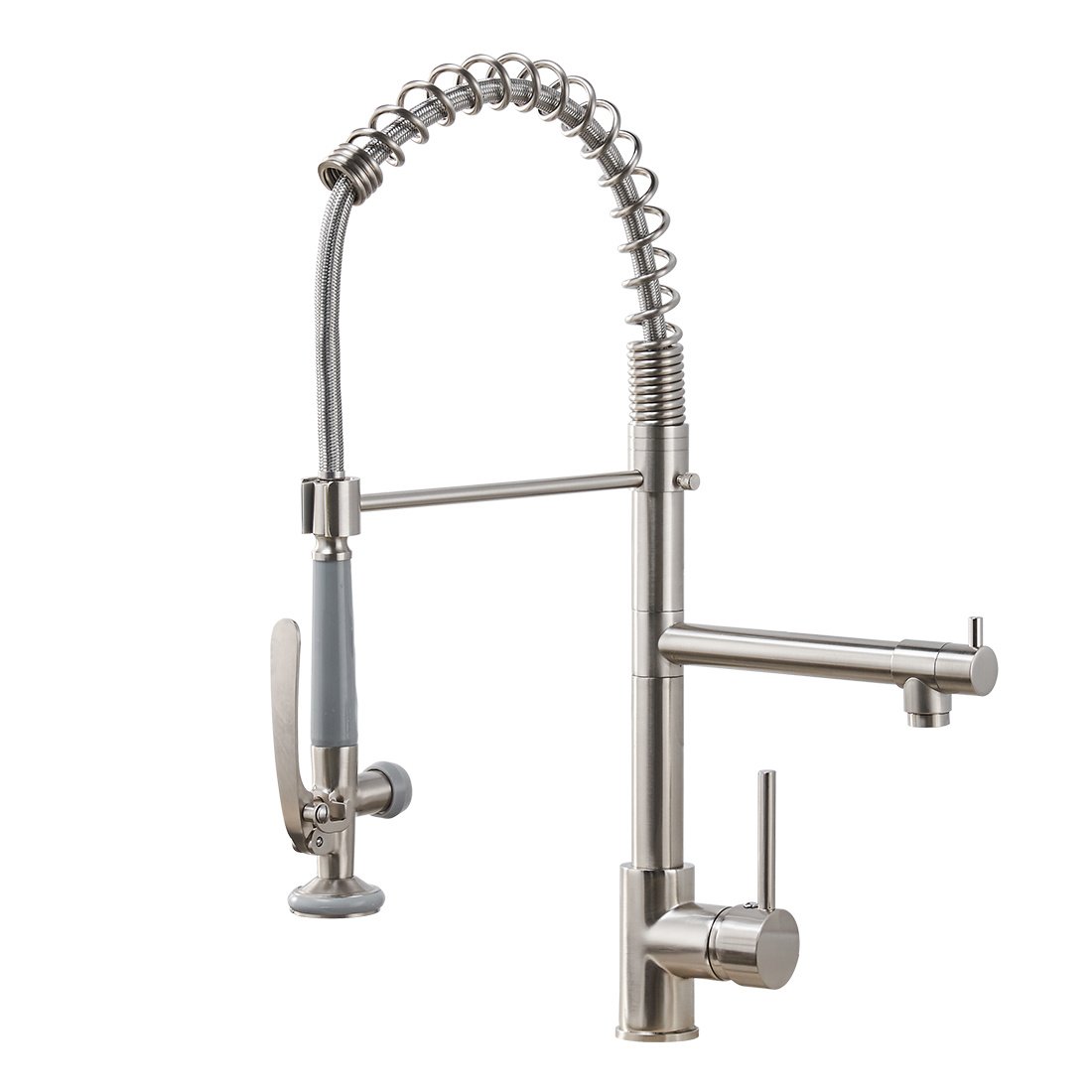 This spring kitchen faucet with pull-down sprayer is the perfect combination of decorative and functional, dedicated to improving kitchen efficiency and creating the modern kitchen of your dreams. The firm docking arm not only helps you to fix the sprayer, but also can be used as a hanging bar for towels, thus saving your kitchen space.The pull-down sprayer and 360-degree rotatable spout design gives you great maneuverability and maximum range of motion for easy all-around cleaning and water-filling tasks.
